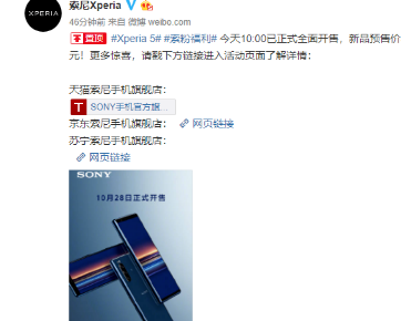 索尼官方微博@索尼Xperia 发布消息称,索尼Xperia 5于今日正式开售,目前在京东、天猫、苏宁和索尼官方旗舰店均有销售。有酒红、钻黑、霜灰和晶蓝四种配色,售价5399元。